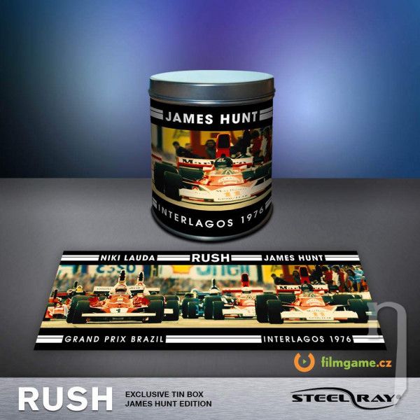 3x exkluzivní oboustranné retro plechy. První strana zachycuje záběry z filmu. Druhá obsahuje grafické upoutávky z vybraných závodů F1 z roku 1976.