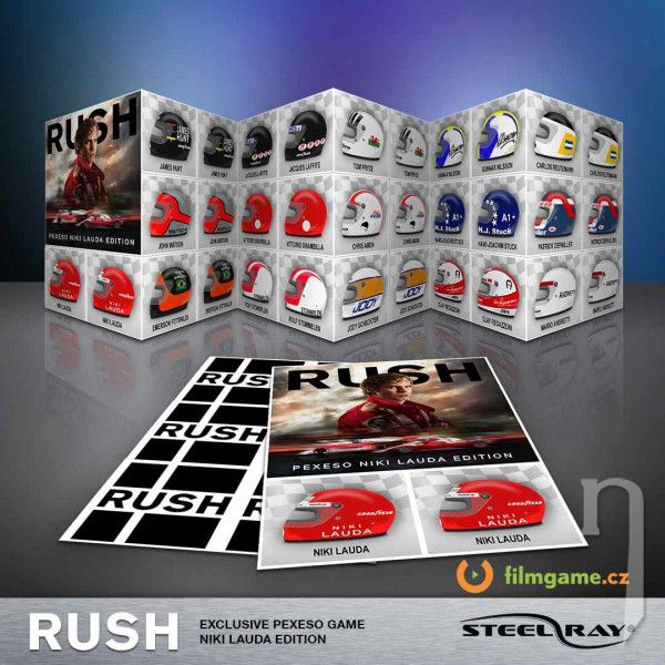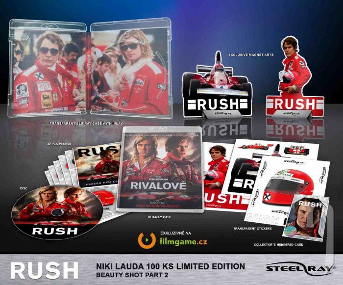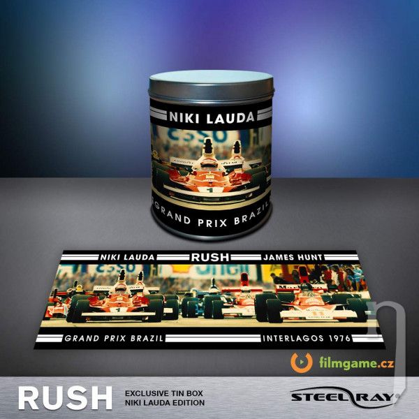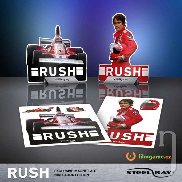 3x exkluzivní oboustranné retro plechy. První strana zachycuje záběry z filmu. Druhá obsahuje grafické upoutávky z vybraných závodů F1 z roku 1976.