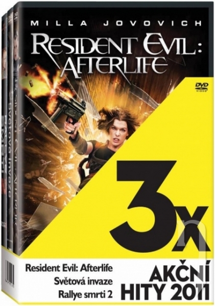 DVD kolekcia obsahuje: 1. Resident evil: Afterlife Čtvrtá filmová adaptace podle stejnojmenné hry od firmy Capcom. Jde, jak už název napovídá, o svět po apokalypse. T- virus už zpustošil celý svět a přeměnil lidi na zombie. Alice pokračuje a snaží se nalezené přeživší dovést do bezpečí. Pomoci se jí rozhodne i starý přítel. Vyrážejí do Los Angeles, které jak záhy zjistí, je plné zombie. Čeká je boj o přežití v pasti způsobené společností Umbrella. 2. Světová invaze Rotný námořní pěchoty (Aaron Eckhart) stojí se svou četou proti nepříteli, který se od těch předchozích zásadně liší. Velkolepý akční sci-fi film Světová invaze přináší napínavý příběh o útoku vesmírných agresorů na naši planetu. 3. Rallye smrti 2 Jedná se o prequel původní úspěšné jedničky. Podíváme so opět na ostrov TERMINAL a do věznice na něm umístěné. Projdeme od doby, kdy byl TERMINAL pouze obyčejnou věznicí ve vlastnictví soukromníků. Po krvelačné rvačce mezi vězni, natočené na zcela náhodně přítomné televizní kamery, což vyvolá prudký ohlas u televizních diváků, je věznice TERMINAL ISLAND přestavěna na místo hostující DEATH FIGHT, zápasy muže proti muži na život, smrt a porážku. Avšak poté, co sledovanost klesne a do věznice je poslán nový vězeň (Luke Goss), známý lupič a skvělý řidič, je DEATH FIGHT zrušen a rodí se DEATH RACE. Závod ozbrojených aut. Jak jinak než na život a smrt! Uvidíte krev, smrt a zrození. Zrození nikoho jiného, než FRANKENSTEINa !