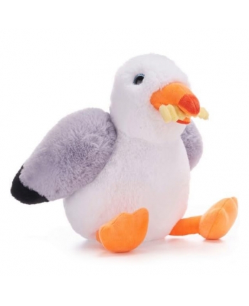 Plyšová čajka, ktorá má v zobáčiku ukradnutý úlovok z pláže. Čajka sa nenechala núkať a hranolku si jednoducho uchmatla.